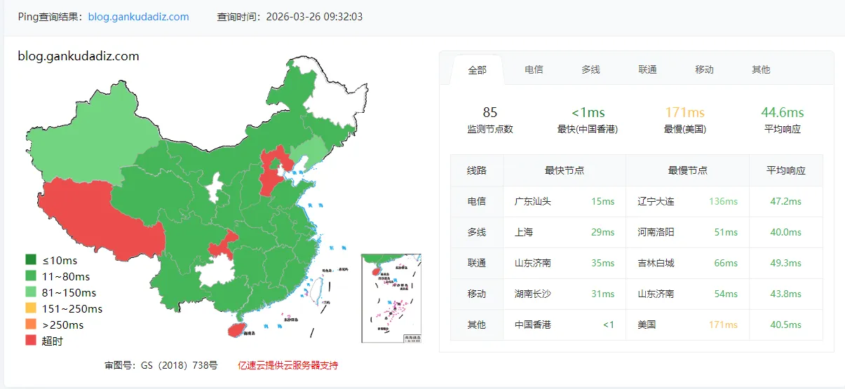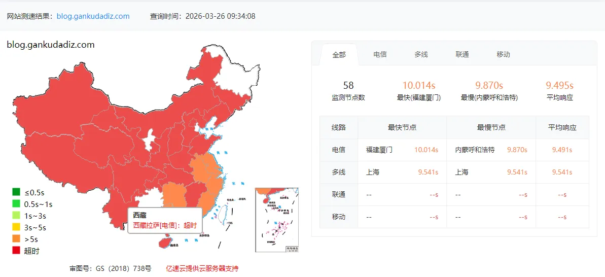 本地浏览器访问博客响应约 700ms,主观感受正常。但使用站长工具对博客域名进行全国测速后,结果触目惊心:大部分地区响应 5~10 秒,大量红色节点。