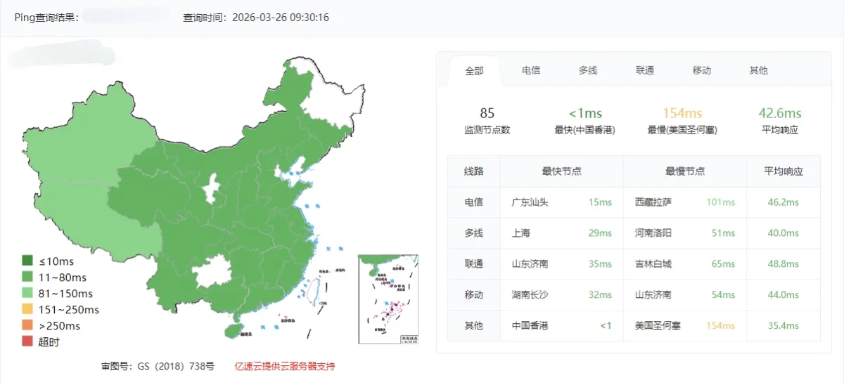 使用 https://tool.chinaz.com/ 对博客首页进行全国多节点测速: