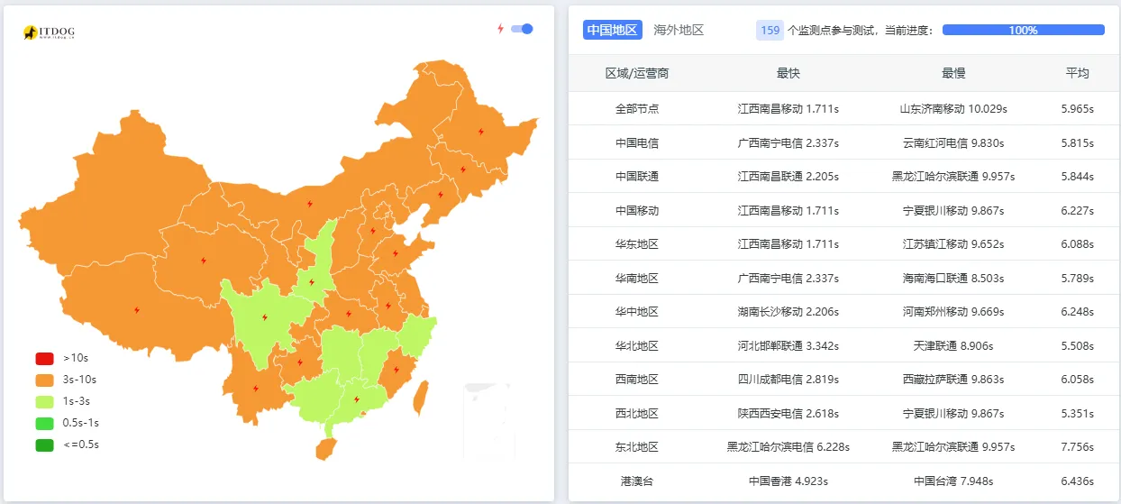 优化完成后,换用支持低并发检测的 itdog 重新测速,得到了截然不同的结果: